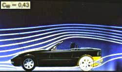 Rear downforce is created by a low pressure area generated by the effect of the Aerofoil section of the transverse rear silencer box, and it's nearby body parts which work as Aerofoil slats. Frontal downforce is created by a high pressure area at the front edge of the bonnet (hood). The forward part of this body section is a concave curve, before turning convex as is more normal. A high pressure area is created just above the front wheels.