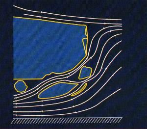 Air flow pattern around the Z1 rear exhaust box and body panels. The rear silencer is an inverted wing, and the rear fender and undertray work as aerodynamic slots or flaps to increase the negative