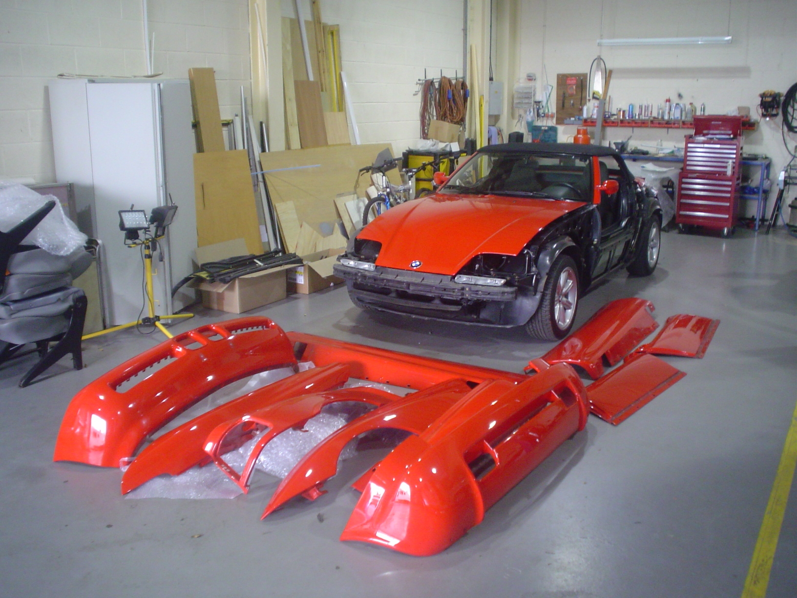 The composite body panels are attached to the car by 'forks' cast into the inside of the panel which locate over a rubber mounting shaped like a cotton reel. Each panel slides fore and aft to locate onto the rubber mountings, and is then secured by a series of dome headed 'torx' bolts, each with a rubber washer. This method of fixing allows the panels to move as they expand and contract with changes in temperature.
