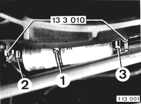 Installing Clamp the fuel feed hose before and after the filter with Special Tools, unscrew screw (1). Loosen hose clamps (2 and 3).