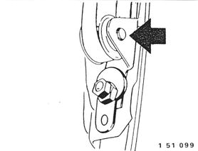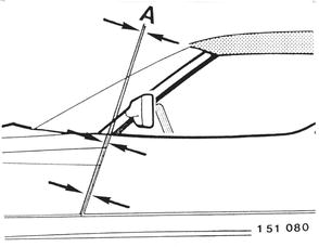 Note: If an uniform door gap can not be reached by tilting the door with the baseplate, make corrections on the door/baseplate connection (guide rollers). Corrections on the door/baseplate connection are permitted only when it had been disconnected for repairs. The door guide on the A pillar is designed with 3 mm (0.118”) thick spacers. The window is used to determine a new thickness, e.g. after an accident. The window glass should run up into the middle of the rubber seal precisely when raised.