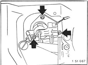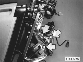Remove door complete with baseplate, unscrew screws. Take off power window motor. Installation: Tightening torque = 5 Nm (3.6 ft. lbs.).